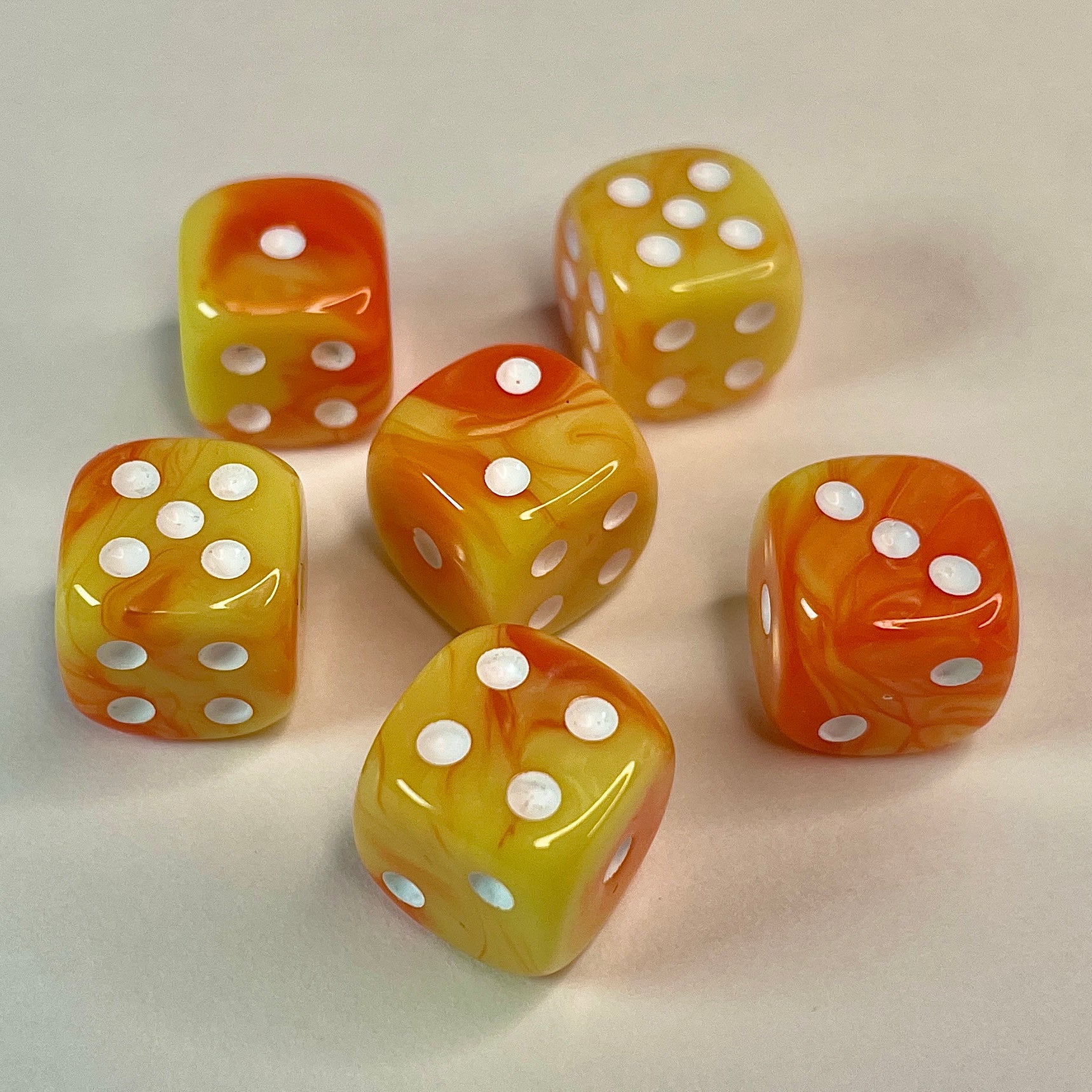 The names sound delicious, but do not eat the dice! Due to variation in manufacturing process, each die has a unique blend of pigment and texture.